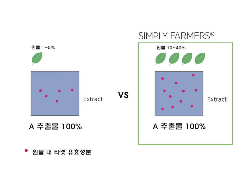 “SIMPLY FARMERS® 원재료의 원물 자체 함량(%)에 대한 Simple하고 기본적인 Question에서 시작한 새로운 브랜드로 신선한 고함량 원물*을 농축 및 추출, 증류하여 얻은 정직한 원재료의 처방을 Guarantee(약속) 합니다.”